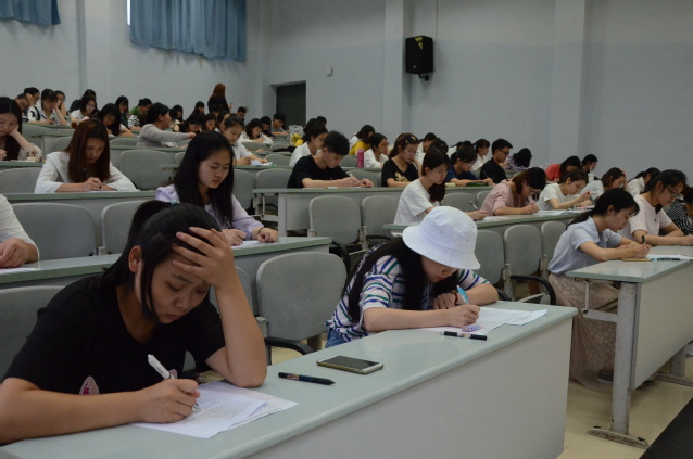考试伊始。首先,监考人员宣读考试的注意事项,并强调一定要在自己的试卷上写上小组的序号,完善考试信息;在考试中应自觉遵守考试纪律,不要交头接耳,使用手机等,强调了如发现一些不好的现象,会取消考试成绩。其次,监控人员分发试卷,考生开始答题。考试试题包括食品营养常识和食品安全常识的相关内容。考试中,参与竞赛的同学们仔细的阅读提干,认真谨慎地进行答题,严格遵守考试纪律。监考员不时走动,以维持考场纪律,现场气氛严静。