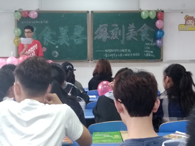 为了让食品二班的每一位同学能够站在丰富多彩的大文化背景下真切地感受饮食文化的魅力,营造健康和谐积极的班级氛围,推进校园文化建设,2018年5月27日,17级食品科学与工程2班的全体同学于崇礼楼317举办了以“美食美客,每刻美食”为主题的特色班会活动。本次活动由班长黄鑫担任主持人,17级食品2班的同学全体参与。