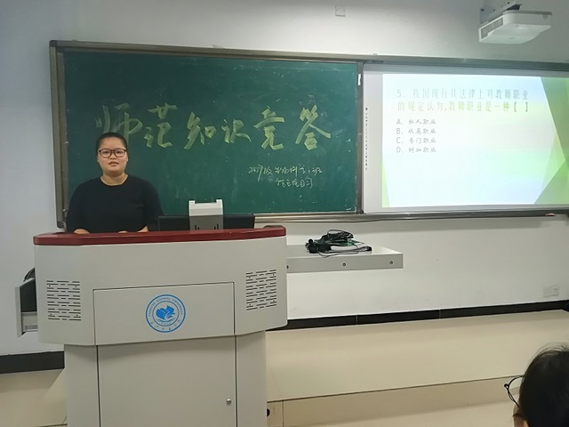 首先,主持人向同学们说明了本次主题班会的目的与内容,让同学们对本次活动有基本了解,并且请同学们谈了在这学期作为师范专业的学生学到的师范专业知识和技能。其中叶春宏同学表示,在学习中收获最大的是实践周时学到的讲课技能以及老师的着装礼仪常识,不仅加深了自己对老师这个职业的认知同时也提高自己的素质。随后便开始了有奖知识竞答比赛,比赛分为知识竞答和游戏两个部分。先是班级的同学自愿分成四组,对主持人的题目进行抢答,然后开始“你比我猜”的游戏,由主持人出题,每组分别进行抢答。最后,主持人总结了本次活动,她提出,现在的学习是为了以后能够更好的做好一个老师,拥有一个合格老师的知识储备而做了更好的铺垫,更重要的是让自己爱上自己的专业,做到乐学乐教。整个活动就这样在愉快的氛围中顺利结束了。