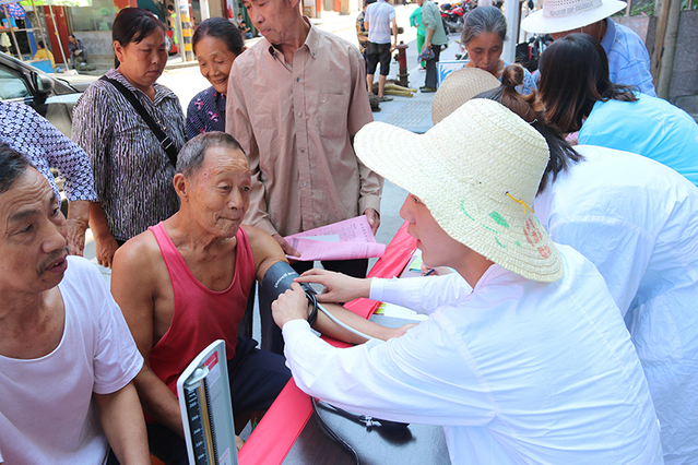 前来参与测血压活动的大多数是60到75岁左右的老人。活动中,青年志愿者们亲切地、面带微笑地询问老人们的身体状况、家住地方,便于照顾部分老人,对于家住偏远的老人将会优先测量。志愿者们在此过程中,认真询问、测量、听测与记录,并根据大部分老人血压偏高的现状,建议他们减少食盐、固醇类食物的摄入,多锻炼身体并保持愉悦的心情。炙热的阳光洒在各青年志愿者的身上,却更加坚定了志愿者服务的决心。