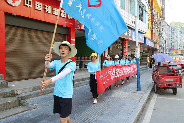 活动正式开展之前,志愿者们在老师的帮助下,完全掌握了血压仪的使用及保管方法。每个活动都需要新颖、易引人注目的宣传方式,而志愿者们则是以一条“龙”的形式,先由一名志愿者高举着志愿者旗帜,剩下的志愿者则排成长列举着活动宣传横幅于大街小巷、赶集市场中游行以吸引居民注意。最后,志愿者们达到摆点目的地开始了本次义务测血压活动。