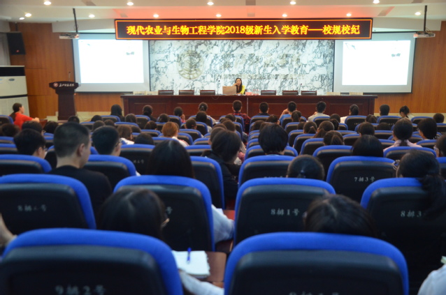 为了让新生更好的了解学校的规章制度及生活中存在的安全隐患,2018年9月12日晚上8:20,现代农业与生物工程学院在鉴湖学术报告厅开展了以“校规校纪”为主题的2018级新生入学教育讲座。主讲人为张敏书记,参与人员为现代农业与生物工程学院2018级全体新生。