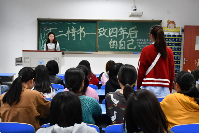 会议伊始,各班活动主持人讲到在这一次的活动形式之下,可以让2018级的同学在他们大学四年开学之际,写下对这四年的期许、对未来的规划、对他们自己的承诺和激励。当大学四年结束后收到这封信时,再来回首这四年难忘的岁月和艰辛的付出,他们心中定是感慨万千。这也为他们四年后的学习生活起到不可磨灭的积极作用。紧接着,在主持人充满激情的讲说下,2018级同学也认真的在纸下描写出四年规划和期许。部分同学也和大家分享了自己四年的安排和期望。生活的诗和远方不仅需要他们跨越眼前的苟且,也需要他们有一个明确的目标和方向。最后在2018级同学们写信完成后,将统一收齐交给2018级的辅导员,作为他们四年奋斗的一个方向和目标,辅导员也将在四年后统一还给他们每个人。