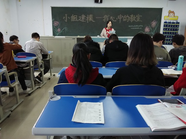 各小组积极开发利用校内外各种资源,开展头脑风暴,精选内容,力求创新。小组的教室模型具不同的风格特点,不仅保留了“名人名言”、“班级公约”“黑板报区域”等传统的教室配置,而且融入了“沙发”、“电脑”“图书架”等新元素,或明亮、简约,或温馨、舒适。小组负责人向同学们讲解了模型的制作过程、使用的材料用具、各板块设计理念等等。同学们多从素质教育、德智体美劳全面发展角度阐述板块设计理念。此外,每个小组还为自己模拟班级设计了班级名片,其内容包括班徽、班训、班主任寄语、班级目标等。