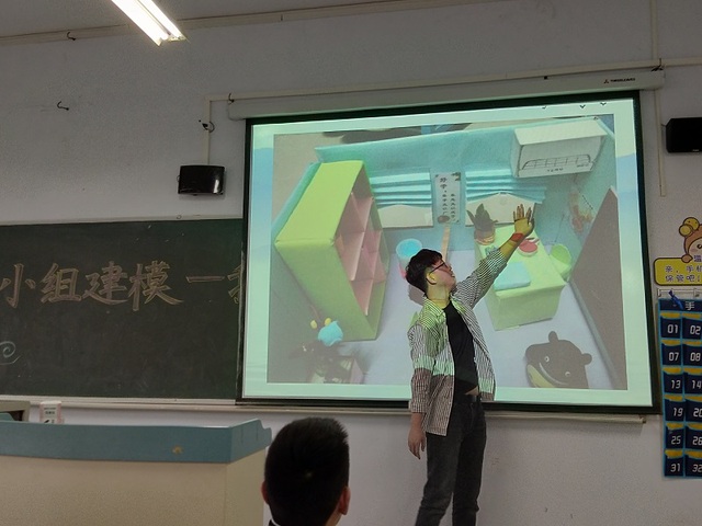 据悉,16级生物科学2班全体同学分为5个小组,每组都有一周的建模时间。早自习开始之前,每小组模型负责人提前将做好的PPT拷贝到多媒体桌面,接着,按组别依次上台讲解教室模型设计。