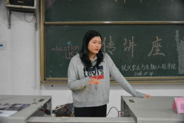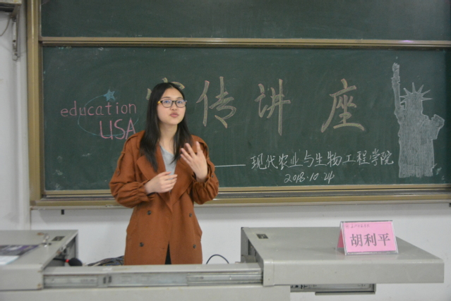 为了让同学们更加清楚的了解到赴美带薪实习的细节,鼓励他们积极参与。2018年10月24日19:00,现代农业与生物工程学院于实验楼03阶梯教室开展了以“暑假赴美带薪实习项目说明会”为主题的讲座。本次活动特别邀请赴美带薪实习负责人胡利平老师以及赴美带薪实习的15级食品2班熊鑫出席此次会议,现代农业与生物工程学院18级全体学生悉数到场。