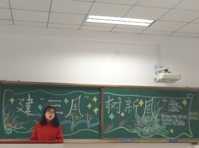为了形成以学风带教风,以考风正学风,以管理促学风,以活动倡导学风,来培养学生的良好学习习惯,积极营造良好的育人氛围。2018级食品科学与工程1班于2018年11月4日下午4点20在崇礼楼316开展了以“建‘三风’,树新风”为主旨的特色团会。此次团会由康莉同学主持,2018级辅导员胡代芳老师及全体同学参与。
