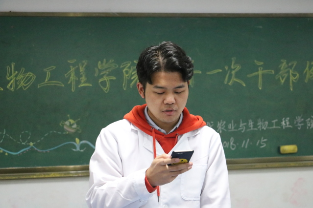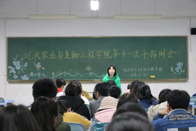 为了更好的完成学院工作,并对干部近期工作进行总结、分析、弥补不足,对近期工作做好规划,使学院工作能够顺利进行。于11月15日下午18时10分现代农业与生物工程学院在正心楼108开展了现代农业与生物工程学院第十一次干部例会。15级辅导员蒋雨珈出席了此次会议,现代农业与生物工程学院全体学生干部与班委参与了本次会议。