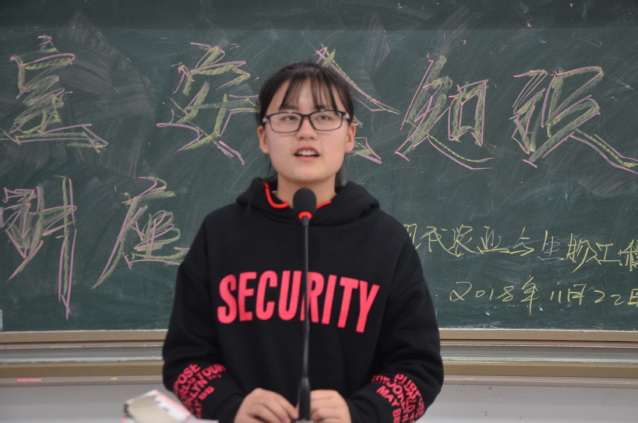为了让同学们掌握安全防范知识,加强自我保护意识, 11月22日晚上19:00,现代农业与生物工程学院于格律楼03阶梯教室开展了以“寝室安全知识”为主题的讲座。此次讲座由潘冰杰担任主持,李月担任主讲人,现代农业于生物工程学院17级、18级全体寝室长参加。