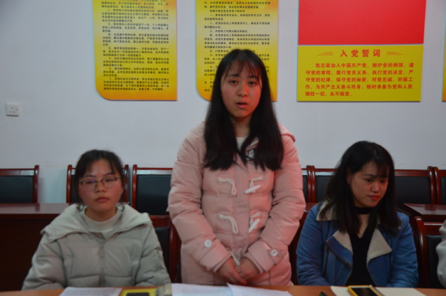 会议伊始由主持人做开场白简单介绍了会议流程。此次会议主要分为三项内容。会议第一项内容组织委员清点到场人数,第二项内容预备党员园林专业17级一班学生唐诗彤、二班学生刘茜、园艺专业17级一班学生廖名静依次进行预备党员个人陈述。本次汇报对象主要围绕自身优缺点、对党的认识、自己思想态度和工作学习感悟进行发言,表明了自己想迫切加入共产党的决心。其次,第一、二介绍人分别发表意见,每位候选人都各有各的优势与劣势。汤诗彤同志成绩优异、对工作有热情做事积极、态度严谨、热情开朗有很好的群众基础但自信心略有不足、干部经历不太丰富、办事效率有点低未来要不断努力加大学习力度;刘茜同志待人礼貌、性格开朗、成绩优异集体观念较强但自学能力不够、人际沟通能力不强且过于拘谨不够大胆;廖名静同志思想政治觉悟较高、入党动机纯正、为人诚恳、责任心强但遇事不够冷静、处理事情不够成熟、遇事急躁效率不高。紧接着,在座的其他党员同志针对性地提出了不足和建议;最后,与会正式党员10人,对转正的3名同志进行了无记名投票,3名同志全票通过正式发展成为预备党员。会议最后,主持人进行了简单的总结。到此,本次会议在掌声中落幕。