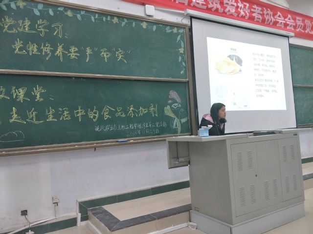 为增强广大党员对食品添加剂的正确认识,丰富自身专业理论知识。2018年11月29日中午12时20分,现代农业与生物工程学院学生第三党支部于诚意楼02阶梯教室进行了以“走进生活中的食品添加剂”为主题的微课堂学习。此次活动由学生党员官孝瑶担任主讲人,参会人员为第三党支部学生党员及入党积极分子。