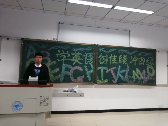 活动伊始,由纪检委员点名,全体成员到齐。接下来由主持人为我们朗诵开场白,并且详细解说了四级考试试卷的分数分配,做题的先后顺序,各题型的难易程度,以及四级考试中应当注意的小细节及一些可用的小技巧,这也算是让同学们吃了颗定心丸。主持人解说完之后,是有趣的游戏环节。第一个游戏叫:“你画我猜”,主持人给出一个英语单词,一个人用肢体动作依序比出英语单词的字母,另一个人要猜出所比单词,第三个人要说出单词的意思,参与者可获得一个棒棒糖作为奖励。同学们个个都活力四射,激情饱满的,纷纷参与到此游戏当中来,教室里充斥了欢笑声。第二个游戏同样生动有趣,同学们先观看一段经典的英语电影片段,然后上台表演者要模仿再现此片段。游戏中泰坦尼克号的经典桥段,即使隔了这么多年,画面依旧唯美的不行,不过上台表演的同学硬是将它表演成了搞笑片,应得教室里又爆发了一阵笑声。愉快的游戏结束后,今天的特色晚自习也就为止了。