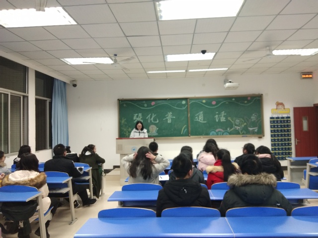 活动伊始。首先,由纪检委员点名,确保班上每一位同学的参加。紧接着,由主持人简单介绍了本次活动背景。她指出,当代社会普通话越来越重要,而普通话是联合国六种工作语言之一,我们作为师范生更要学好普通话,。班级三位同学对如何学习普通话进行了分享。由主持人做出总结,学好普通话都是建立在多交流和多练习的基础之上,同学们应该在平时多与他人用普通话进行交流并持之以恒。然后,活动进入到以念绕口令为形式的游戏环节,同学们不仅在游戏中找到了乐趣。接下来,由三位同学进行了不同主题的演讲。最后,主持人对同学们的演讲进行了简单总结,她提出,我们应该勇于面对生活的挫折,接受自己的不完美。同时,她指出普通话等级证书时效性只有三年,所以在平时还是要好好练习普通话,争取将来考得更好。至此,活动圆满结束。