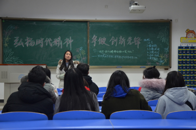 活动伊始,由各班纪检委员点名,确保全体学生到齐。其次,由文体委员带领同学们唱班歌。紧接着由主讲人对本次班会的活动背景及目的进行了简洁的介绍,她强调了时代精神的弘扬的重要性,并表示当今时代,和平与发展都是时代的主题。随后主讲人提出以“时代精神的内涵有哪些?”和“作为一个大学生,我们应该如何做才能成为创新先锋?”这两个问题为本次讨论的主题,同学们都积极参与,踊跃发言。同学们表示“中国的时代精神的内涵有改革创新是新时代的核心、改革开放是进一步解放和发展生产力的必要要求等。”、“要想做创新先锋,就必须把自己所学的专业知识学好,然后在自己所学的专业上进行创新。”最后,则是人文书库推荐及各班班委进行事务传达,班委传达了《关于做好圣诞节、元旦节学生安全教育管理的通知》。至此,此次班会圆满结束。