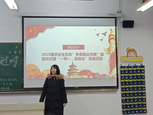 随着近年来我国高校不断扩招、大学生就业的期望值不断提高,大学生就业形势更加严峻,就业总量压力与结构性矛盾并存。在此就业形势下,为发挥党员的模范先锋作用,现代农业与生物工程学院学生第一党支部于2018年12月28日下午18:00在诚意楼303教室开展了2019届毕业生党员“争做就业先锋”宣誓仪式暨“一带一,促就业”实践活动。此次活动由学生第一党支部书记蒋雨珈同志主持,现代农业与生物工程第一党支部全体学生党员参加。