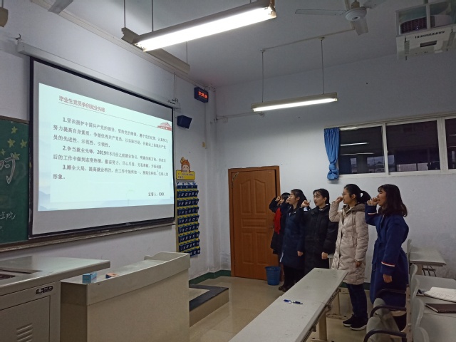 会议伊始,支部书记蒋雨珈老师对本次活动的主要目的做了阐述,并表明:“思想决定态度,态度决定一切,作为学生党员,无论在学习还是生活上起到模范作用,临近毕业,更要在树立正确的就业观念上做表率,带动其他学生顺利就业。”紧接着,2019届毕业生党员进行了庄严宣誓:“我将坚决拥护中国共产党的领导,坚持党的纲领,遵守党的纪律,认真学习,努力提高自身素质,争做优秀共产党员,以实际行动,在就业上体现共产党员的先进性、示范性、引领性。争当就业先锋,2019年3月份之前签订就业协议,明确发展方向,并在以后的工作中做到态度热情,勤奋努力,尽心尽责,无私奉献,开拓创新。顾全大局,提高就业档次,在工作中始终如一,展现生科院,生科人的形象。”最后,程元艺同志表示:“只要通过自己不懈的努力,成功就业并非艰难的蜀道,作为学生党员要起到榜样作用,首先提高自身的综合素质,以此带动身边的同学。”