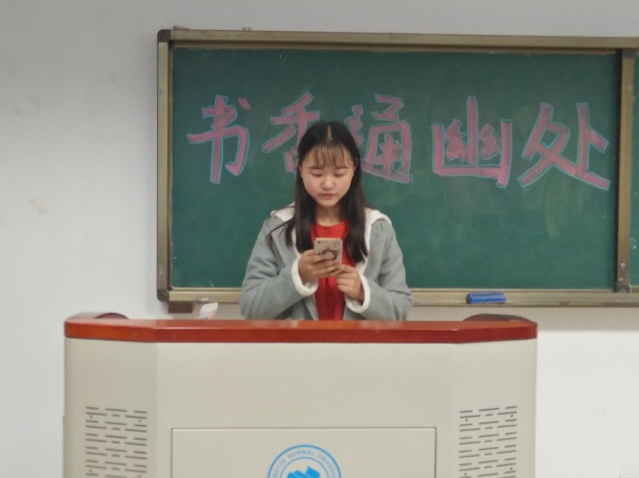 “书香通幽处,分享任我行”主题特色晚自习活动首先是由纪检委员张川雨同学点名。然后是由主持人为同学们介绍本次的活动背景,“书籍是人类进步的阶梯”读书是每个人学习成长的有效途径。学生精神成长,需要丰富的阅读滋养;学生专业发展,需要经典的学习专著作为引领。戏剧大师莎士比亚曾说过,书籍是全世界的营养品。生活里没有书籍,就好像没有阳光。书能给我们知识,能进化心灵,孕育一代又一代的人,然而只有爱读书的人才能在书中找到智慧的金钥匙。书籍已经成为我们生活中不可缺少的一部分。再是由主持人宣布活动开始,同学们分组进行“数字大爆炸”游戏,由输掉的一方抽取相应号数的同学上台分享自己在假期看过的书籍。活动最后由主持人总结并送上寄语,希望同学们在且读且思,且思且行中吸取他人经验,不断完善自我,成就自我组建学习型团队,营造更为浓厚的学习氛围。