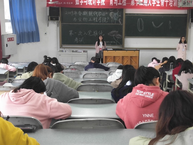 为培养造就社会主义事业接班人,加强党员队伍建设,充实党的新生力量的需要,提高学院入党积极分子以及被推优同学对党的认识,为更多优秀的同学入党打下坚实的基础。2019年3月19日中午12:20,现代农业与生物工程学院于03、04阶梯教室开展了现代农业与生物工程学院春期第一次入党推优考试。此次考核由现代农业与生物工程学院部分学生党员担任监考人员,参与考核的有学生党支部2019年春期的入党积极分子。