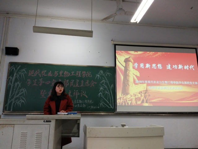 为深入学习贯彻习近平新时代中国特色社会主义思想。2019年3月22日下午14:30,现代农业与生物工程学院学生第一党支部于诚意楼202教室开展了以“学用新思想,建功新时代”为主题的民主评议会暨组织生活会活动。本次民主评议会暨组织生活会活动由学生第四党支部书记胡代芳老师担任主讲人,学生第四党支部全体成员参与。