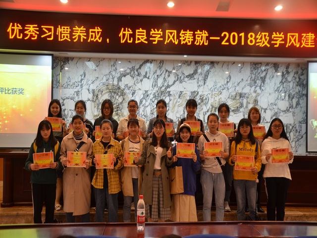 据悉,活动以年级顺序先后开展。活动率先从17级开始,由各班级学委依次进行PPT讲解,汇报班级学风建设情况。随后,由辅导员何思源老师对本年级学生进行相应的学风教育。接下来开展活动的是18级,有李吉老师到场指导,辅导员胡代芳老师主讲。其中,李吉老师强调,学风建设必须要落实到每一个人身上,这关系到人才的培养和一流课堂建设。因此,要提高课堂学习的管理。同学们要树立目标,明确自己的职业规划和新时代对人才的要求。随后由学生代表张雪梅同学进行有关学习的分享。最后,18级辅导员胡代芳老师通过引用古诗词“少壮不努力,老大徒伤悲”激励学生们努力学习。此外,她还针对近期同学们理想信念淡漠,不能严格自律的情况提出一些建议。同时,胡代芳老师也为获得“格律青春”阅读笔记优秀奖的同学进行颁奖并合照。最后开展活动的是16级的同学,由张敏书记到场指导,辅导员陈丹老师主讲。在活动中,张敏书记提出,学院一直重视学生成长成才,对此,建议同学们应当珍惜所处的美好时代,趁着大好的青春年华奋发拼搏,创造出更好的未来。随后辅导员陈丹老师也对16级全体学生进行学风教育。活动进行过程中,各年级活动的最后一项都带领了全体同学齐唱“我和我的祖国”这首歌曲,伴随着响亮的歌声此次团会活动也落下了帷幕。