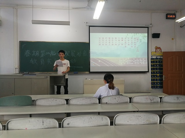据悉,此次活动共有三个流程。活动伊始,拟发展对象观看了《平“语”近人——习近平总书记用典》第七集:绝知此事要躬行节目。本集《绝知此事要躬行》集中阐释了习近平总书记的实践观,选取了习近平总书记常用的“功崇惟志,业广惟勤”、“积土而为山,积水而为海”、“空谈误国、实干兴邦”等典故,从尚行——言胜于行、敏行——明辨善行、力行——身体力行三个维度,深入浅出地讲明了,习近平总书记关于笃行的论述是对我国传统文化中知行合一的精神和马克思主义实践观的继承和发展。紧接着,由拟发展对象现场分享观后感。杨洪同志说到:“业广惟勤,“业”对于我们大学生来讲就是学习,“勤”对我们大学生来讲就是勤学,在今后的学习生活中定将勤奋好学,立志成才。”活动最后,缪伊雯同志提出,希望同志们在观看影片之后能够有所思考,有所收获。
