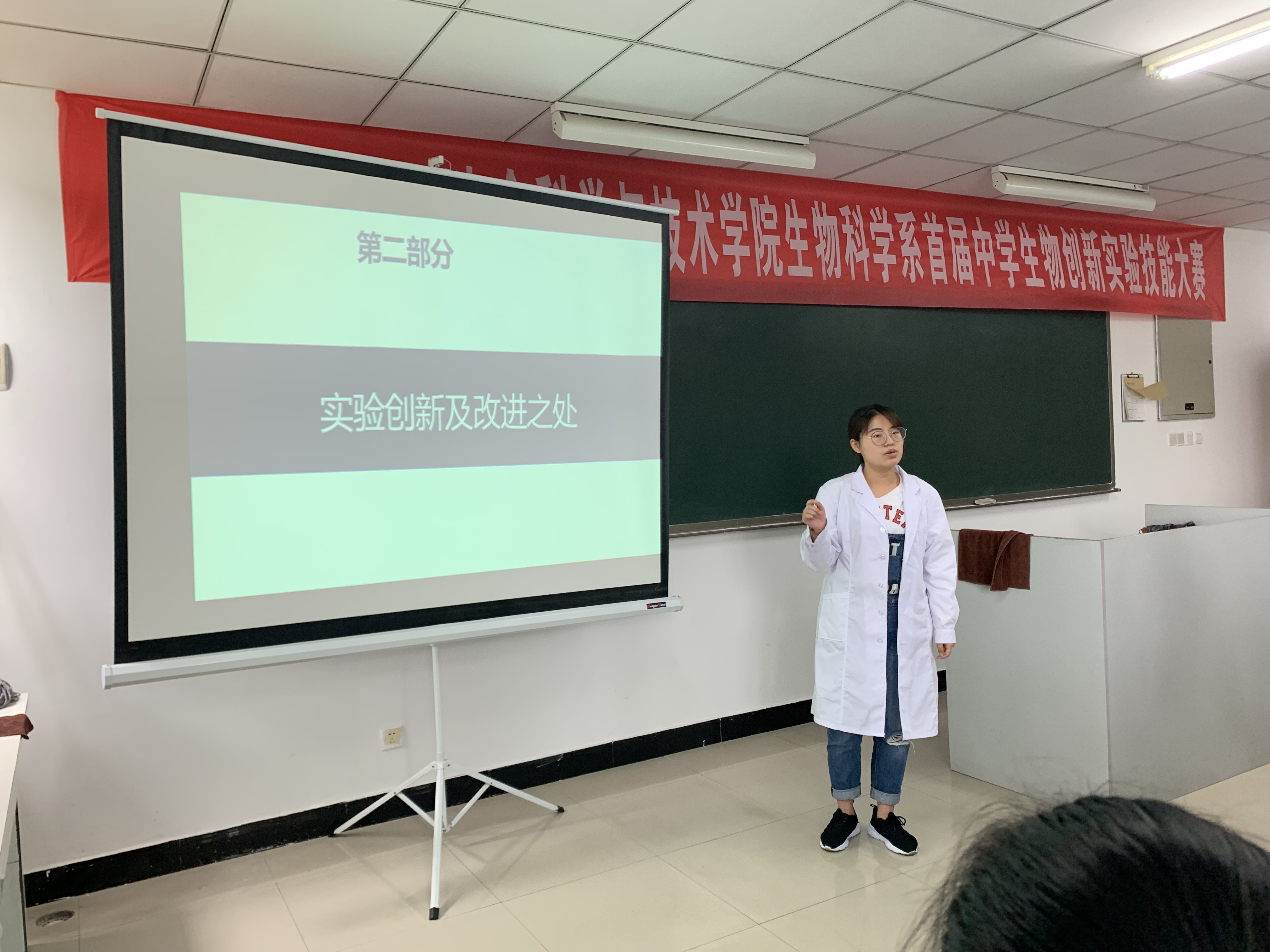 为进一步推进高校大学生创新创业实践教育,培养生物科学专业师范生创新精神和创新实践能力,提升学生专业素养和中学生物实验教学能力及操作技能,我院于5月24日下午14:30分在格律楼3204举办了首届“中学生物创新实验大赛”。此次比赛由初赛和决赛两个部分组成,初赛以提交ppt的形式,共选出八个小组进入决赛,决赛以讲解ppt和现场演示实验操作过程展开。