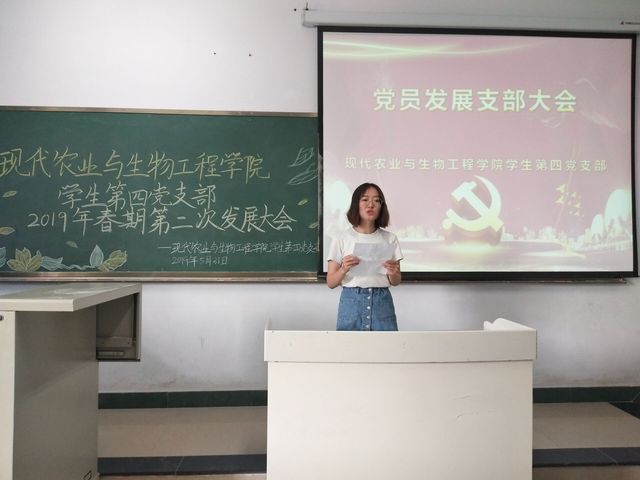 为践行党的章程,发展党的教育事业,为党注入新鲜血液。2019年6月4日下午13:00,现代农业与生物工程学院学生第四党支部发展党员支部大会于诚意楼201顺利举办。本次支部大会由学生第四党支部书记胡代芳同志主持,第四党支部全体党员和发展对象出席参加。