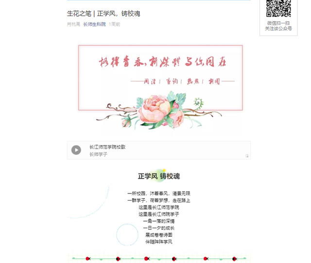 活动前期准备期间,学院新媒体运营中心通过“长师生科院”微信公众号、QQ群等线上平台宣传此次活动,通过分设不同模块的活动形式,笔者通过邮箱选择性投稿。活动期间,通过一个月的征稿活动,全院师生积极投稿。最后,经过老师们的最终评选审核,共选《浮生若梦,为欢几何》《正学风,铸校魂》等共计20篇优秀稿件,本次获选稿件其质量高,思想性丰富,同学们从多角度多方面对身边事务、社会热点、学科知识等以自身独特的视角进行剖析、分享,展现了同学们的文采。