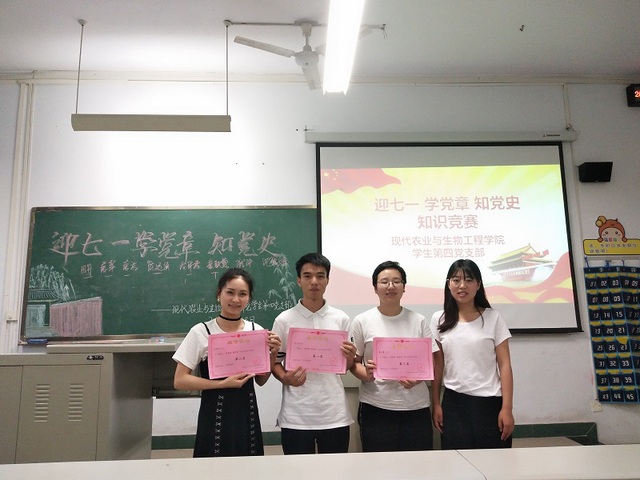 党员教育管理是党的建设基础性经常性工作。党的十八大以来,以习近平同志为核心的党中央高度重视加强党员教育管理工作,推动形成全党从严从实抓党员教育管理的良好态势。近日,中共中央印发了《中国共产党党员教育管理工作条例》,其中以习近平新时代中国特色社会主义思想为指导,以党章为根本遵循,总结吸收实践创新成果,对党员教育管理的内容、方式、程序等作出规范,是新时代党员教育管理工作的基本遵循。为按照党章要求和《条例》规定,接受党组织的教育管理,贯彻党的指导决定,扎实党员理论学习。现代农业与生物工程学院学生第四党支部在2019年6月28日晚上七点在诚意楼201教室举办“迎七一,学党章,知党史知识竞赛”为主题的支部六月组织生活会。本次活动由现代农业与生物工程学院学生第四党支部全体党员参与。