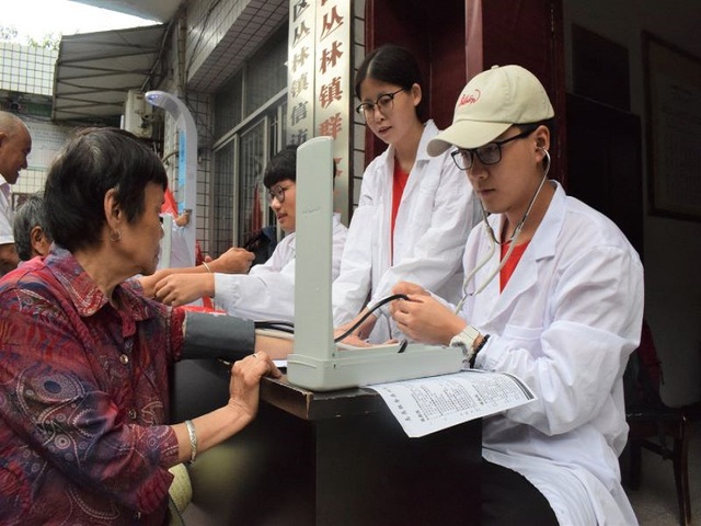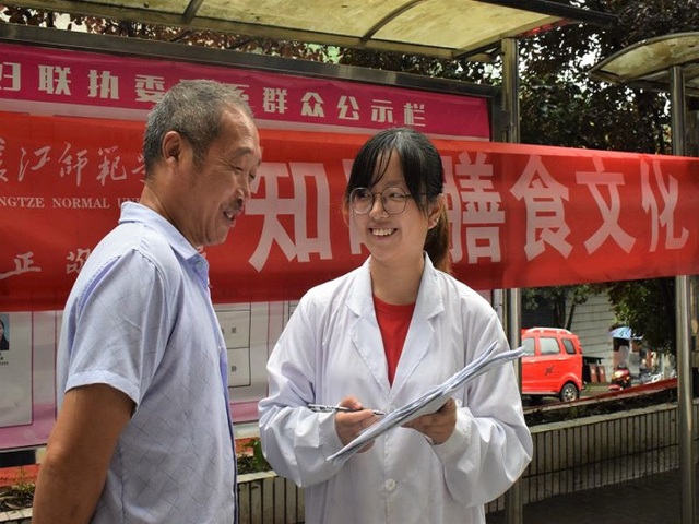 在这过程中,发现参与测血压活动的大多数是50到75左右的老人。活动中,青年志愿者们亲切地、面带微笑地询问老人们的身体状况、家住地方,便于“照顾”部分老人,例如,家住的比较远来赶集的老人会优先测量。志愿者认真询问、测量、听测、记录。再根据大部分老人都有血压偏高的现象,建议他们减少食盐、固醇类食物的摄入,多锻炼并保持愉悦的心情。将膳食健康知识用传单和口述的方法,让当地居民有一定程度地了解。也采用现场抽样调查问卷的方式进一步的了解了万盛区丛林镇的饮食生活情况。临近中午的疲惫降临在各青年志愿者的身上,可是政府的帮助下,更加坚定了志愿者服务的赤诚之心。志愿者们与政府人员的谈话中,进一步了解了当地的民生民态以及当地民众的基本生存和生活状态,以及民众的基本发展机会、基本发展能力和基本权益保护的状态。政府为民众鞠躬尽瘁,只为人民的健康小康生活奋斗!
