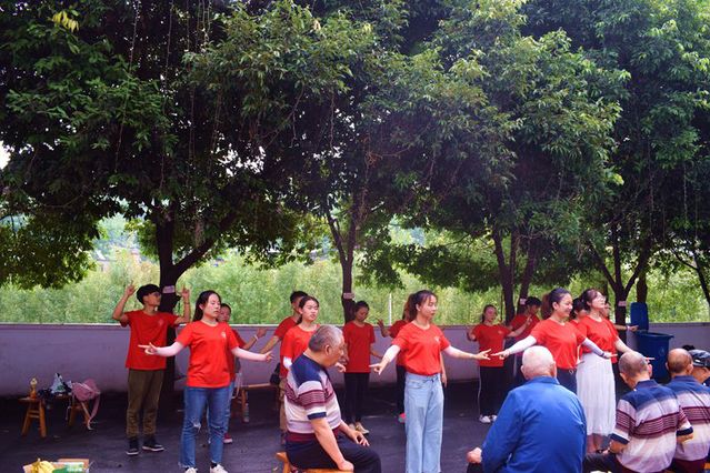 趁阳光正好,志愿者们端出小板凳围坐在坝子上,为老人们带来才艺表演。 “一语口中国,一瓦顶成家,都说国很大,其实一个家”“我和我的祖国一刻也不能分割,无论我走到哪里都流出一首赞歌”志愿者们爱国热情高涨,老人们也纷纷唱起红歌,顷刻间,院内歌声与欢笑声此起彼伏。志愿者们为老人们捏肩膀、捶背,认真倾听老人们的故事,轻轻敞开老人们沉睡的心扉。已经87岁高龄的陈爷爷感叹到:“在旧社会,老人是会被时代抛弃的,现在,国家重视我们,青年学生关心、问候我们,在这里每顿饭都吃的很丰盛,政府在医疗上为我们提供了充分的保障,没事的时候便在四周走走散步,我们非常开心。”老人们也告诉志愿者:“要珍惜现在的生活,好好学习,发挥青年大学生应有的责任感为中国梦贡献力量。”