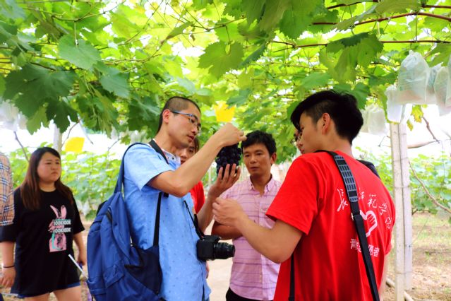一行人马不停蹄地赶往永胜葡萄园。高仕权说:“葡萄园是老百姓亲力亲为地从一个小葡萄院变成一个能带动当地积极发展的自家产业。”园主娄刚亲切地迎接了前来调研的教授、博士们,并现场摘下新鲜葡萄让教授、博士们和志愿者们品尝,并对葡萄园里种植的玫瑰香、夏黑、巨峰、金手指等葡萄做了详细介绍。翟立峰教师经过对葡萄及土壤的观察,发现雨水过大是影响葡萄质量的重大因素,并提出三点意见:一是制定科学规划,扩大葡萄种植面积;二是政策技术的扶持,引进高技术人才;三是利用新时代网络进行广发外宣,扩大销售范围。同时,其他教授、博士也采取了很多标本,进行实验室进一步研究。