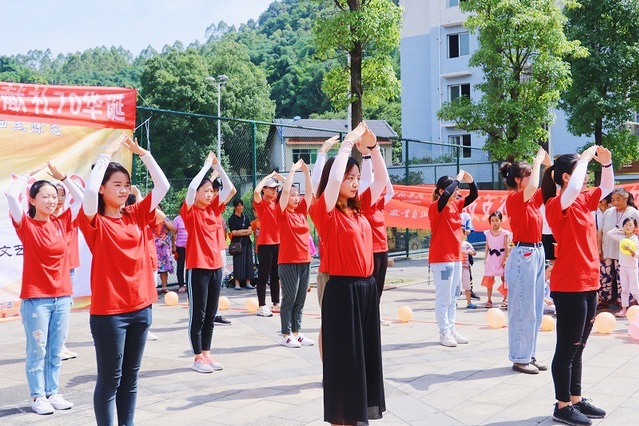 花球殷勤捧锦旗,歌声飘转进人心;舞姿高亢引鸟鸣,歌尽家人留意念。昨日,回忆又不舍,甜蜜着每个人的梦。今日,一场视觉盛宴,澎湃着每个人的心。为彰显当代大学生的精神风貌,以庆祝祖国70华诞为主。7月15日,美丽的丛林之村,长江师范学院“丛林之光”社会实践团队与丛林镇党委、政府携综合文化站共同举办了以“我和我的祖国”为主题的文艺演出正在如火如荼的进行着,出席本次文艺表演的人有万盛经开区丛林镇纪委书记高仕全、万盛经开区团委副书记霍雨佳、长江师范学院张敏书记带领教授、博士和“丛林之光”团队志愿者 。