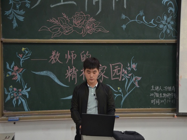 2019年10月11日晚上19:00,现代农业与生物工程学院于格律楼04阶梯教室开展了校友回校做师范生的讲座,由梁珊老师主持,万继涛学长主讲,参加讲座的是19级生物科学专业的学生。