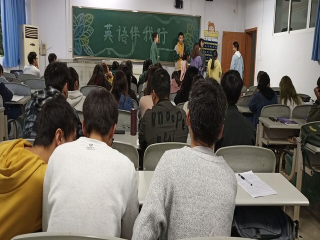活动伊始,由两班纪检委员分别点名,确保全员到齐。接着由主持人讲开场白,并阐述英语的重要性。活动第三项,主持人随机抽取6人到讲台上进行“你比我猜”英语单词游戏,主持人随机出单词告诉比划的人,猜的人除了要知道单词意思还要正确念出来,一共进行了四轮。最后,主持人总结活动,并提醒同学们为四六级做好准备。