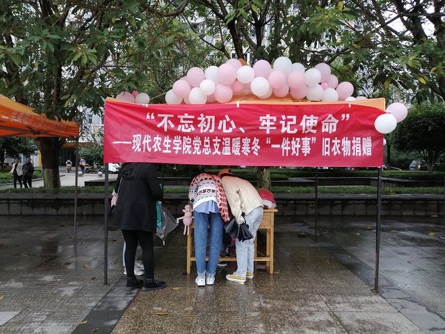 为了将温暖带给贫困山区的孩子,让他们在寒冷的冬夜不再受冻。现代农业与生物工程学院党总支部于2019年11月11日上午10点整至15日上午12点整在南苑食堂门口搭建起了传递爱心的帐篷,专门来收集学生们的旧衣物捐赠给那些需要帮助的孩子。