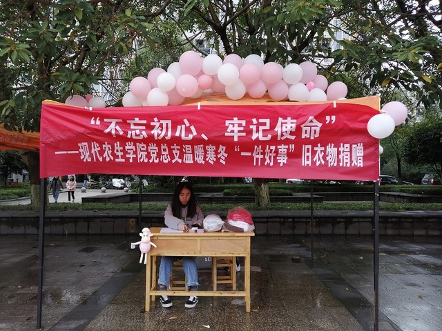 为了将温暖带给贫困山区的孩子,让他们在寒冷的冬夜不再受冻。现代农业与生物工程学院党总支部于2019年11月11日上午10点整至15日上午12点整在南苑食堂门口搭建起了传递爱心的帐篷,专门来收集学生们的旧衣物捐赠给那些需要帮助的孩子。