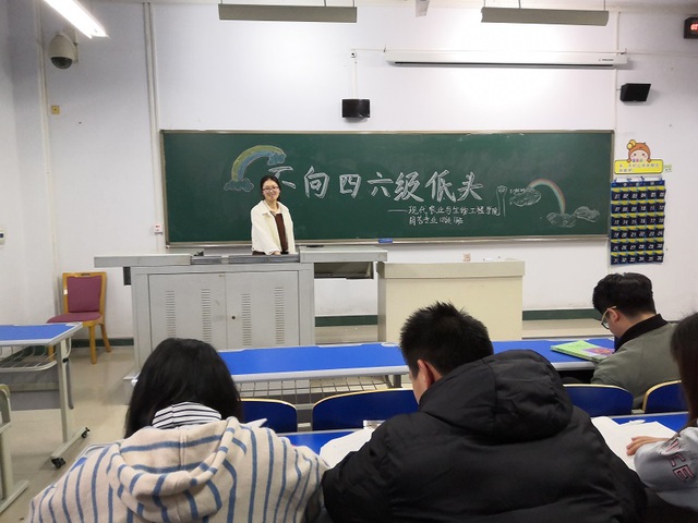 2019年十二月份的四六级考试即将来临,这对于我们大二学生来说又是一场艰苦而又担忧的挑战,为了让同学们调整好心态,好好备考英语四六级,2019年11月21日早上7点30分,现代农业与生物工程学院2018级园艺专业在诚意楼403进行了“不向四六级低头”为主题的特色早自习。此次活动由罗亚兰担任主持人,2018级园艺专业全体同学参与。