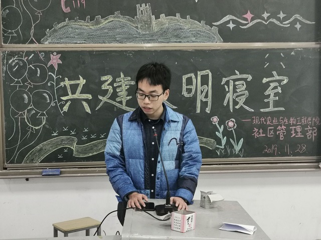为更好地对学生进行宿舍安全管理,消除学生宿舍内的各类安全隐患,改善寝室环境卫生,2019年11月28日19:10现代农业与生物工程学院于格律楼03阶梯教室开展了以“排忧患,齐发展,共建文明寝室”为主题的培训活动,此次活动由社团管理部杨浩同学主讲,2018、2019级全体室长及生活委员参加。
