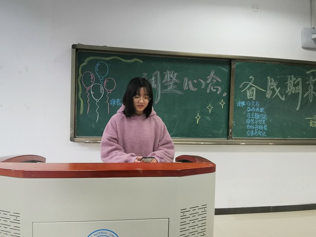 为了让同学们及早进入复习,并对即将到来的期末考试引起重视,增加同学们对学习的兴趣,提高应试能力,抓紧时间复习,减少班级不及格人数以及促进2018级食品科学与工程1班同学的学习交流。特此于2019年12月8日星期日下午五点十分,在崇礼楼316教室举办了此次“调整心态,备战期末”的特色班会。刘青菊同学担任主持,2018级食品科学与工程1班全体同学参与。