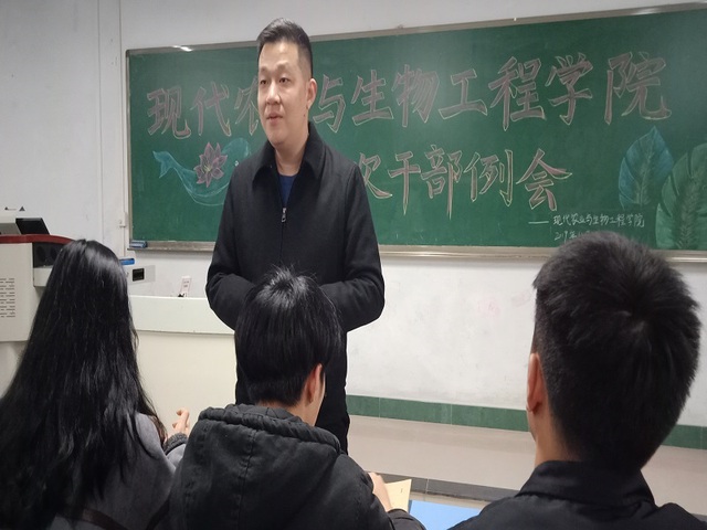 为调动广大学生干部的积极性,推动学院建设工作。现代农业与生物工程学院于2019年12月12日下午18:10在正心楼109教室召开第十一次干部例会。此次例会由院团委书记李吉老师主讲,各班三大班委及部门干部参加。