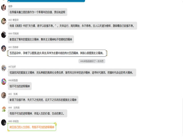 此次线上会议的成功开展,让同学们更加深入了解了“五四精神”和这一代青少年的使命与担当。通过对革命者的敬仰和缅怀,学生们深刻感受到美好生活的来之不易,真切地认识到要牢固树立宗旨意识,用青春的担当来扛起国家的希望。