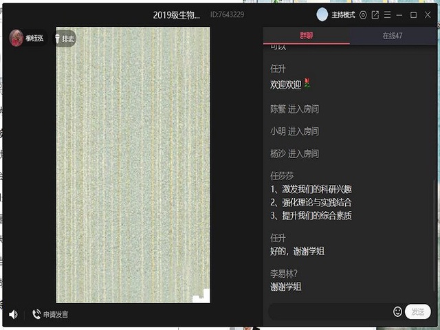 新冠肺炎爆发之初,许多大学的科研室对病毒的研究做出很大的贡献,为了鼓励同学们积极参加科研,锻炼实践能力、壮大科研力量,多做学术研究,为国家做贡献。现代农业与生物工程学院于2020年4月12日在线上开展了以“学生党员进班团会之科研力量”为主题的活动。此次活动由现代农业与生物工程学院学生第一党支部学生党员李懋同志、秦媛同志、任莎莎同志主讲,17生科2班、18生科2班和19生科3班全体同学参与。
