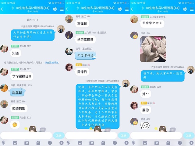疫情当前,又正值雷锋日,为弘扬新时代雷锋精神,鼓励学生在做好自身防护的基础上积极投身志愿服务,展现青年人的时代担当,为打赢疫情防控阻击战贡献青春力量,践行新时代雷锋精神,2020年3月8日下午,现代农业与生物工程学院开展了《学生党员进班团会之新时代雷锋精神的践行》线上活动,现代农业与生物工程学院学生第一党支部王秋霞、呼雪琦和李琳三位学生党员分别对接17-19级学生并担任本次班团会的主讲人。现代农业与生物工程学院17-19级各班学生参加了本次会议并进行了热情的交流。