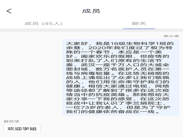 本次活动共分为三个流程进行。首先三位学生党员进入相应班级的会议群,对具体抗疫英雄事迹进行分享讲解。其次由全体学生就英雄事迹发表心得体会。各班学生踊跃发言,班会活动精彩纷呈。最后学生党员提醒同学们居家学习期间要勤洗手、多开窗,适当运动,时刻注意自己的卫生安全。至此,本次学生党员进班团会活动圆满结束。