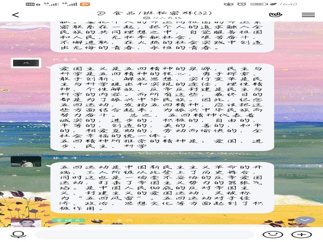 线上会议伊始,团支书黄洁清点完人数后便利用qq音乐播放团歌,班级同学一同跟唱。紧接着详细地讲述了何鑫同学见义勇为的高尚行为。然后,同学们进入主题讨论环节,其中问到了三个问题。在问题1:从何鑫身上我们学到哪些精神?中,有些同学回答到:在危急时刻挺身而出的英勇精神,是中华民族流传了千百万年的正义精神,是对社会无私的奉献精神,是我们当代中华儿女都应该具备的时代精神。问题2:五四运动的意义有哪些?里,也有人回答:五四运动是一场彻底的反帝反封建的爱国运动,他揭开了新民主主义革命的序幕,并开创了新民主主义革命的开端;提倡了民主与科学的精神,激励着青少年奋力追求进步和光明。问题3:作为当代大学生,我们应该怎么样传承五四精神呢?有人回答到:对当代青少年而言,我们仍然要坚持反剥削反压迫的精神,并且矢志不移地坚定中华儿女对祖国的赤诚,热爱之心,发扬中华美德,勇于解放思想,树立创新意识,自觉地担当起社会历史责任。最后,学委表达同学们在假期应认真听课,按时完成作业,不要挂科。至此,本次团会圆满结束。