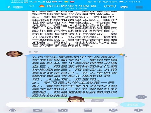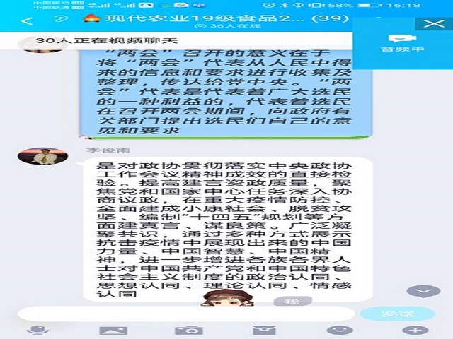 为深入学习并贯彻两会精神,团结起来,开拓进取,2020年6月7日下午16:00现代农业与生物工程学院17、18、19级全体同学于线上开展了以“研学两会精神,担当时代使命”为主题的团组织生活会。会议由各班相关负责人主讲,班级全体同学参加。