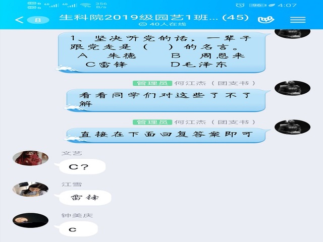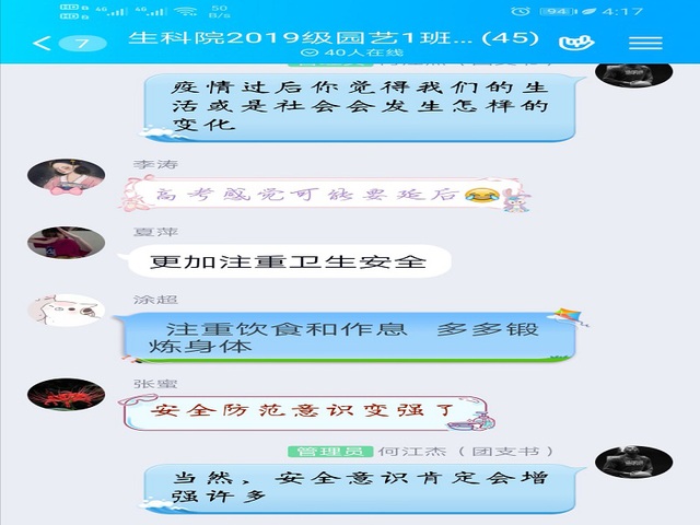 今年的3月5日是毛主席题词“向雷锋同志学习”57周年纪念日,也是第21个中国青年志愿者服务日,恰恰在2020年突如其来的疫情中,我们看到了许多雷锋一样的“身影”为全国人民无私奉献。2020年3月15日下午16点整,现代农业与生物工程学院在班级QQ群上以群讨论发言的形式开展了本次团会。本次团会主题为“同舟共济,青春偕进”。此次团会由各班相关负责人主持,现代农业与生物工程学院2017、2018、2019级全体学生参与。