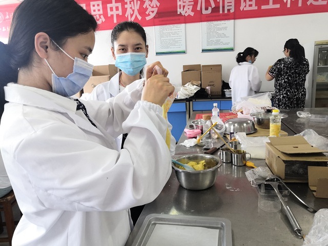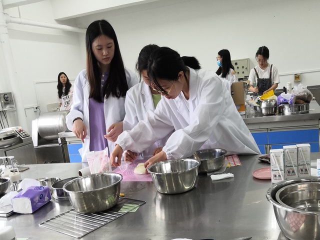 6月22日上午8:20分,全体人员到达实验室,小组成员领取了当天所需要的食材后就展开了产品制作。第一天大家都按照自己提前设计好的方案来实行,但是途中遇到了一些问题。比如做的番茄酱太稀、果酱太酸、面团拉不成膜、泡芙外皮太硬等。根据这些问题,小组成员一起商讨,找到解决问题的办法,重新修改实验方案。第二天继续制作产品,有了前一天的经验,大家做起来都比较熟练和顺手。但有的小组还是因为糖、盐、黄油等比例没找到而导致产品味道稍有欠缺。大家还互相品尝产品,相互提意见,根据他们的反馈在此基础上进行改动,使产品尽量符合大众口味。实践第三天,所有小组通过前两天的努力和经验的累积,都找到了合适的配方,大家把各自的产品都展示出来,供老师和其他同学互相品尝。