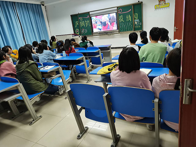 活动开始前,由宣传委员带领同学们布置了主题板报,然后同学们开始观看抗击新冠肺炎疫情报告会的影片。在影片中,我们看得到疫情期间医护人员的伟大,一心为民,无私奉献,同学们再次体会到生命的可贵,医护人员们那小小的身躯担负起巨大的责任,值得我们每个人去尊重,去铭记。疫情并不可怕,可怕的是人心的涣散,还有人心的自私,只要我们有风雨同舟,患难与共的意识,什么都不能打倒我们。